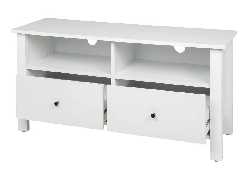 Otro mueble para el salón práctico, bonito y elegante, es este diseño de Lidl de estilo rústico en acabado blanco. Tiene 2 amplios cajones con tiradores de metal y dos compartimentos abiertos, con pasos para los cables en la parte de detrás. Resistente, fácil de limpiar y con protectores en las patas para no dañar el suelo. Tiene unas medidas de 113 x 57 x 40 cm (L x A x F) y cuesta 49,99€.