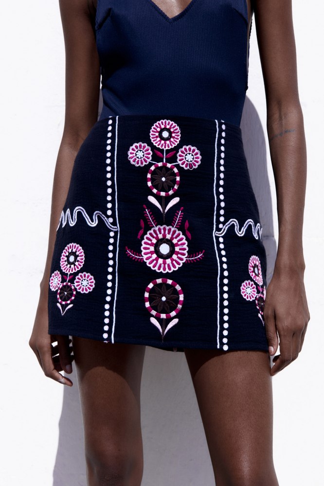 Esta falda es una de las más llamativas de Sfera. Con base en un elegante tono azul marino, sin duda uno de los detalles por los que destaca es por su bordado en colores rosa pastel. Perfecta para combinar con todo y con un corte mini muy favorecedor, ahora te puedes hacer con ella por tan solo 19,99 euros. Antes costaba 25,99, por lo que es un buen ahorro.