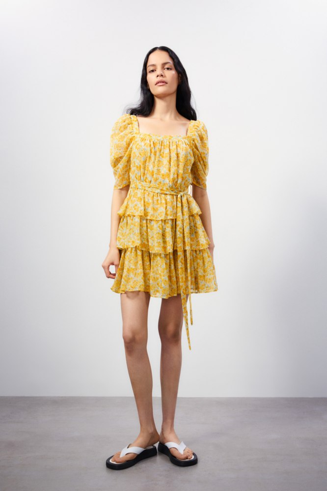 8Vestido de capas, en el tono amarillo que más se lleva