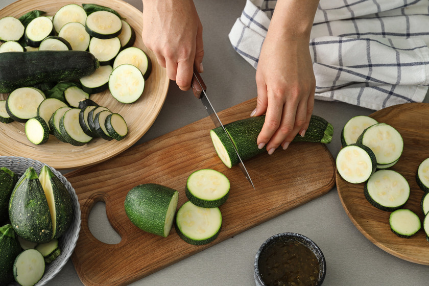 Una vez que hemos espolvoreado el queso parmesano, pasaremos a cortar los calabacines. En esta receta no pelan el calabacín, pero si no te gusta la piel puedes retirársela utilizando un pelador o un cuchillo. Antes de cortarlo es importante limpiar la verdura para eliminar todo tipo de resto o suciedad que pueda tener, después lo cortamos en rodajas finas y las colocamos encima del queso.