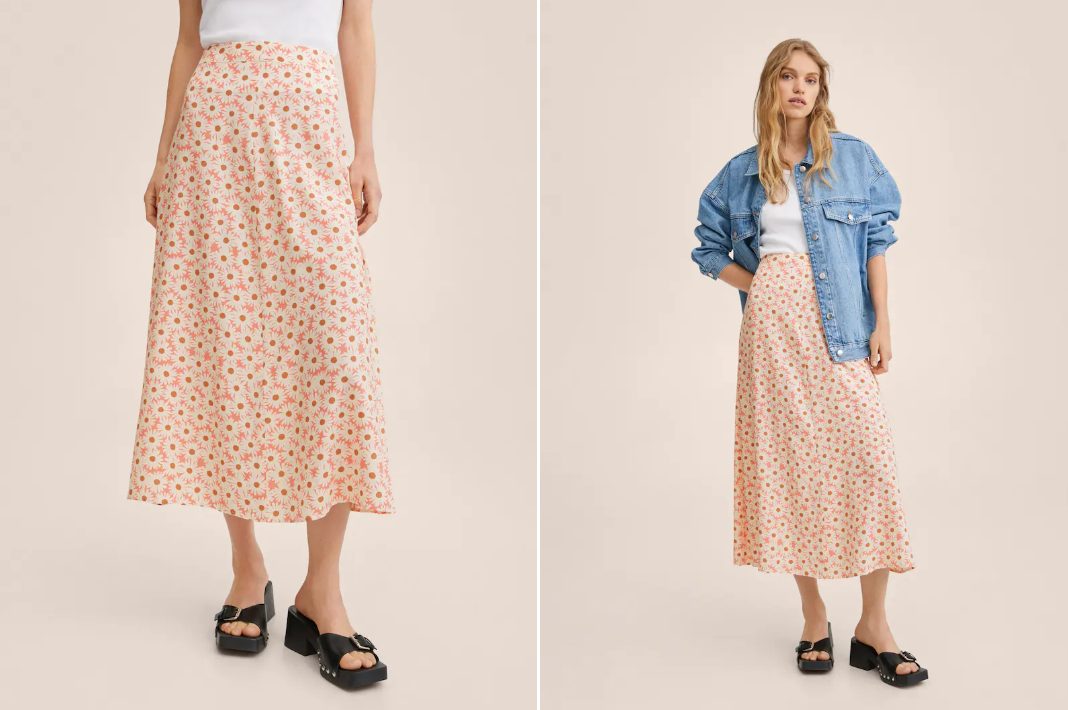 Otra de las faldas que más destacan dentro de la sección de rebajas de Mango es esta. También de corte midi, llama sin duda la atención gracias a sus colores vibrantes, así como por su diseño, con un bonito estampado de margaritas. Ideal para combinarla con todas tus prendas, ahora te puedes hacer con ella por solo 15,99 euros cuando antes costaba 25,99.