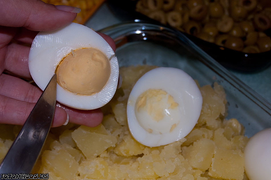 En este punto, con la ensaladilla rusa ya casi a punto, es el momento de rescatar los huevos que tenías reservados y pelarlos. Después, córtalos en pequeños cubos y añade a la receta. Para terminar de montarla, corta las aceitunas rellenas en pequeñas rodaja y agrega también a la elaboración. Vuelve a remover para que se junten todos los sabores.