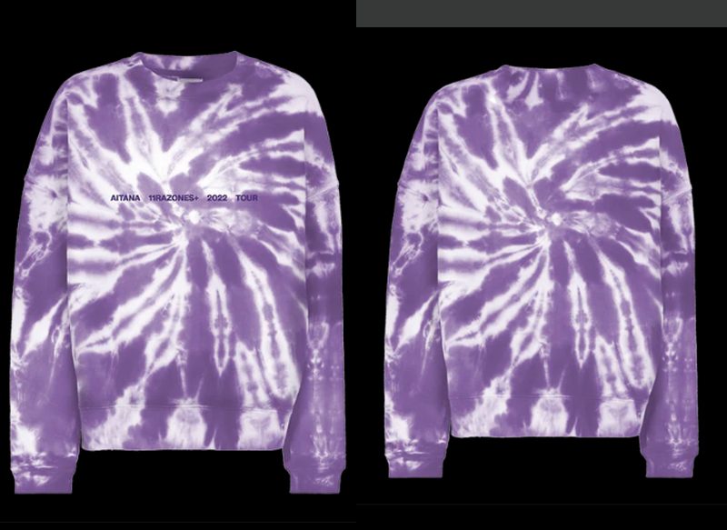 Entre las prendas más llamativas que se pueden encontrar en la colección de merchandising ’11 Razones Tour’ de Aitana Ocaña cabe hacer mención a esta sudadera tie dye ’11 razones+ Tour’, cuyo precio de venta es de 55 euros.