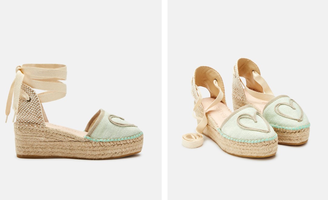 En el Corte Inglés también vimos estas alpargatas de cuña elaboradas en lino viejo que están rebajas en un 50%. Tiene la talonera color natural y cierre con cintas atadas al tobillo. Lo mejor es el detalle de corazón en pala y que están hechas a mano en España. La punta tiene una terminación redonda y la altura de la cuña es de 6,5 cm de altura. Pertenece a la marca Macarena Shoes y su precio es de 37,50 euros.