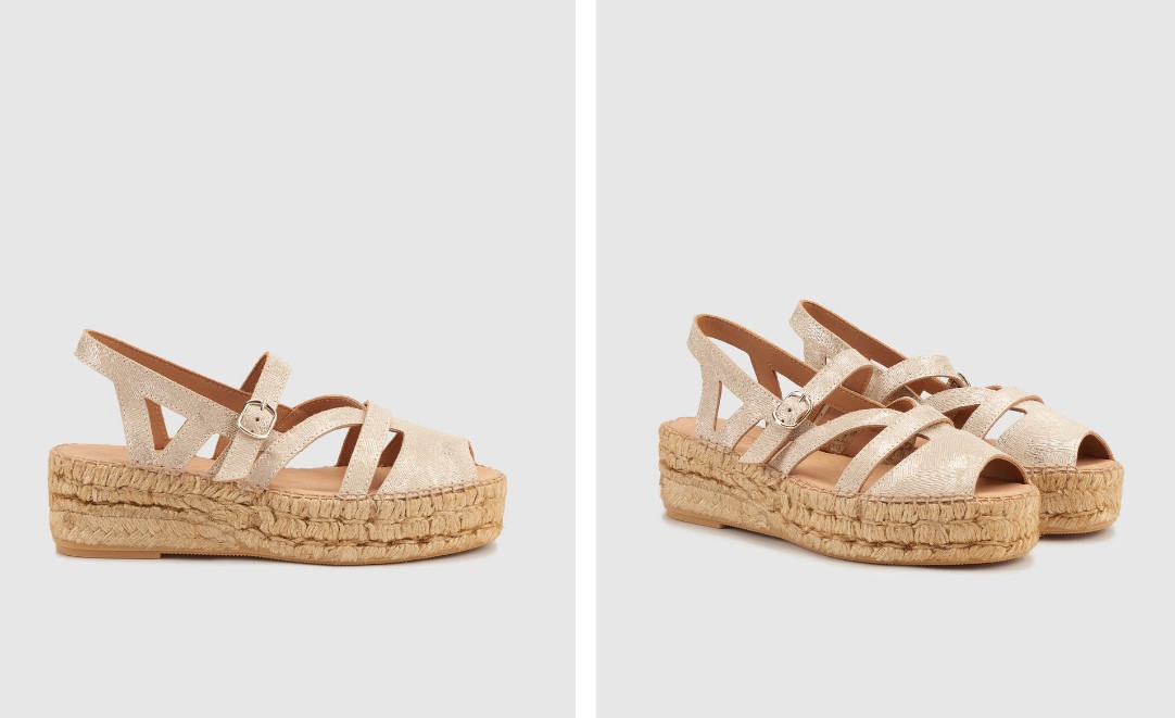 Hemos visto en El corte Inglés también este modelo de alpargatas de Naguisa en piel vacuna de color beige. Tiene adorno de tiras y cierre con hebilla. La cuña tiene una altura de 5 cm, con plataforma delantera de 4 cm. Sin duda es una alternativa más elegante e impecable para no renunciar a la comodidad en tus eventos y añadir ese toque extra de glamour a tus vestidos de verano. El precio es de 72,50 euros y está rebajado en un 50%.