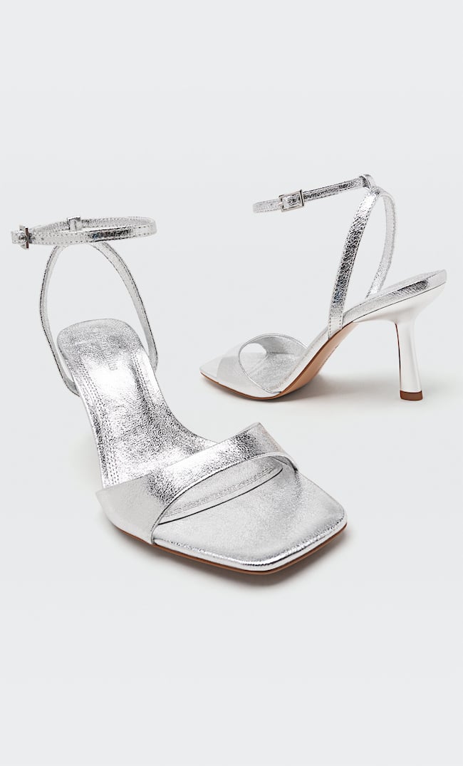 Otro modelo de sandalias de Stradivarius es de tacón fino disponible en varios colores, nosotros elegimos en color plata ideal para cualquier ocasión y evento. Tiene detalle de tira en la parte detantera y cierre mediante hebilla lateral. Plantilla interior del mismo tono que la sandalia y la altura de tacón es de 7 cm. Viene con plantilla técnica flexible de espuma compuesta de látex, diseñada para ofrecer un mayor confort. Su precio es de 25,99 euros.