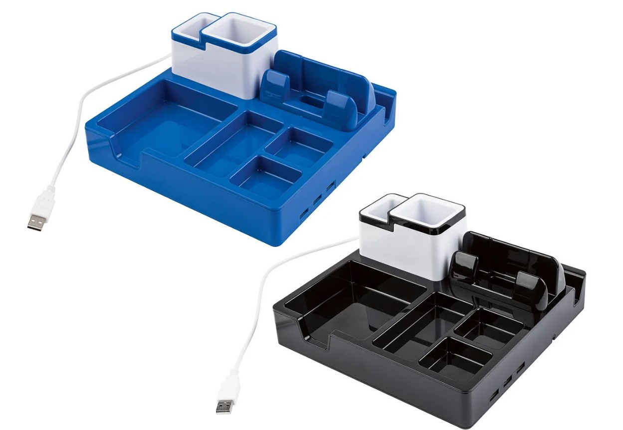 Organizador de escritorio multifuncional y compacto, permite cargar dispositivos externos y transmitir datos. Sirve para incluir accesorios de escritorio como p. ej: bolígrafos, reglas, rotuladores, etc. Ideal para tenerlo en la habitación de tus hijos, o donde pasan sus horas estudiando. Viene con 3 USB de tipo A. Las medidas son 21,6 x 21 x 9,52 cm (L x F x A). Disponible en Lidl en color azul o negro a solo 8,99 euros.