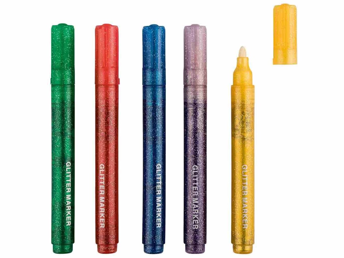 Rotuladores de purpurina vienen en un pack de 5 con aplicación antigoteo. Son ideales para papel o cartulina. Son colores intensos con efecto brillante decorativo. Ya sea para subrayar, resaltar, destacar o incluso pintar, los también llamados marcadores siempre son un buen aliado. Todos los niños querrán usarlo en el cole. En Lidl están a la venta por 2,99 euros.