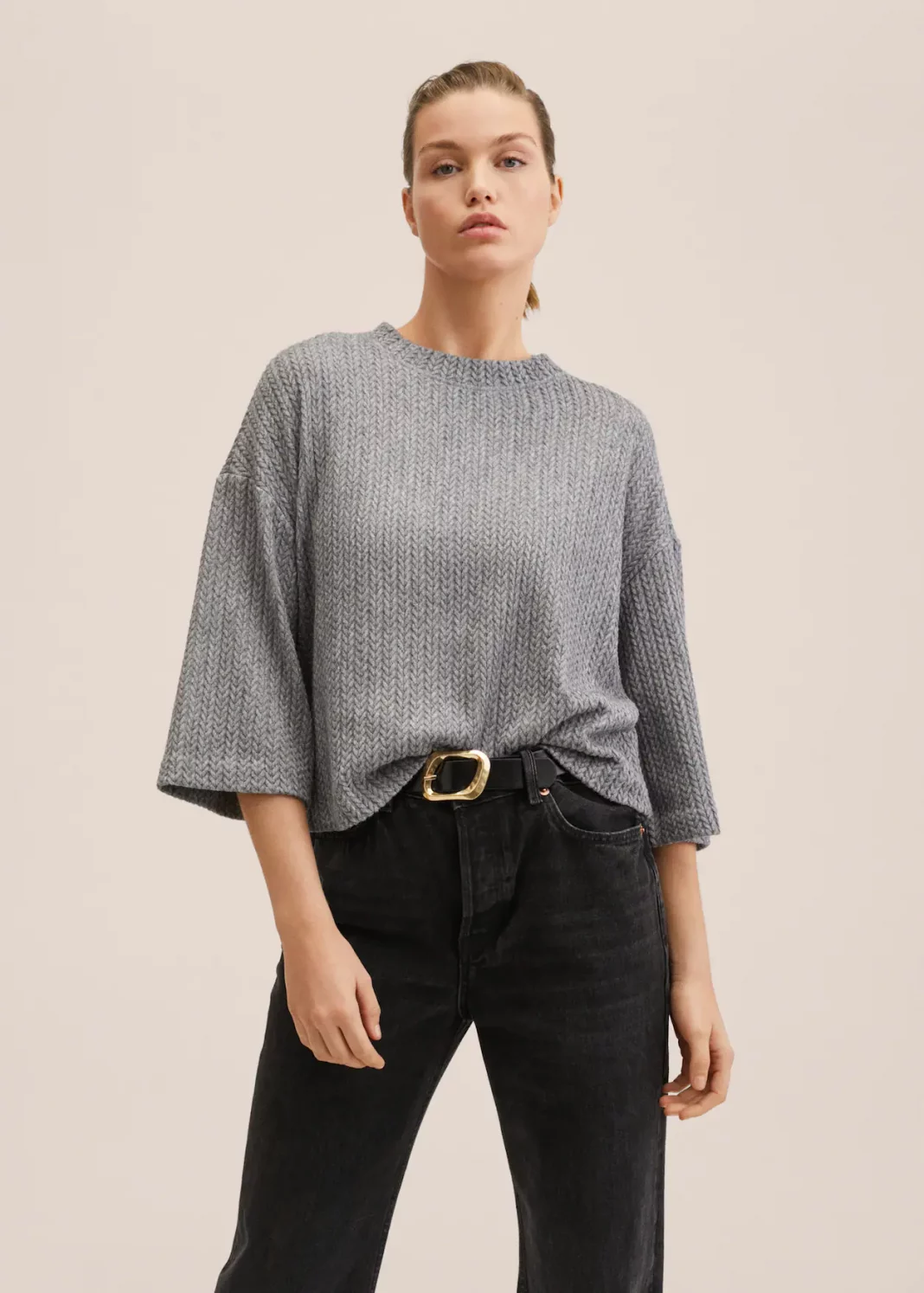 Para finalizar las gangas que tienes que comprar sí o sí en Mango, tenemos esta sudadera textura trenzas. Está disponible en gris clarito y color crudo, con un corte estándar, una manga tres cuartos que es lo más curioso de esta prenda, diseño oversize para ir a la moda, con un cuello redondo para una mayor comodidad. Además, el precio es uno de los fuertes de esta prenda, ya que la puedes comprar online por tan solo 8,99 euros, una verdadera joya que no podemos dejar escapar.
