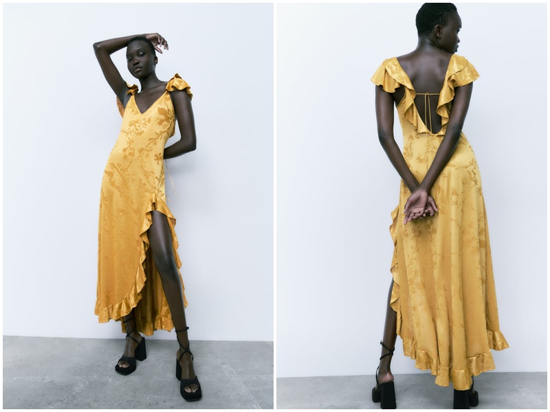 Hemos este otro vestido de invitada de la nueva colección de Zara, ideales para acudir a una boda, comunión o evento como para ir a cenar. Es con escote pico color dorado y manga sisa acabada en volante. Tiene un detalle de abertura en delantero con volantes y cierre en espalda con lazada. Está confeccionado con 100% poliéster. El color la convierte en una opción muy llamativa, atrevida y estilosa. Su precio es de 35,95 euros.