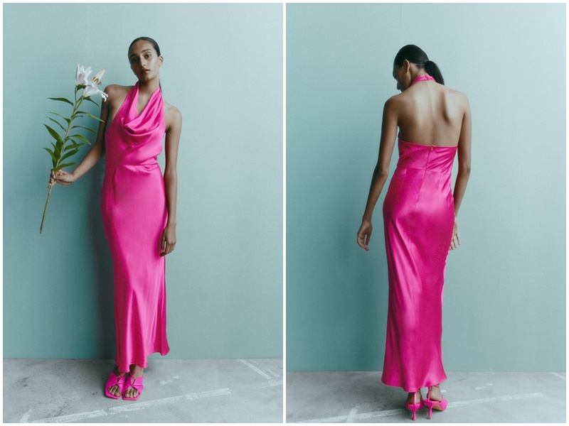 Hemos este otro vestido de invitada de la nueva colección de Zara, ideales para acudir a una boda, comunión o evento como para ir a cenar. Es estilo halter de escote fluido con detalle de espalda abierta. Viene con cierre en espalda con cremallera oculta en costura y botones forrados a tono en cuello. El color fucsia lo convierten en un vestido empapado de tendencias y clave de estilo. Su precio es de 35,95 euros.