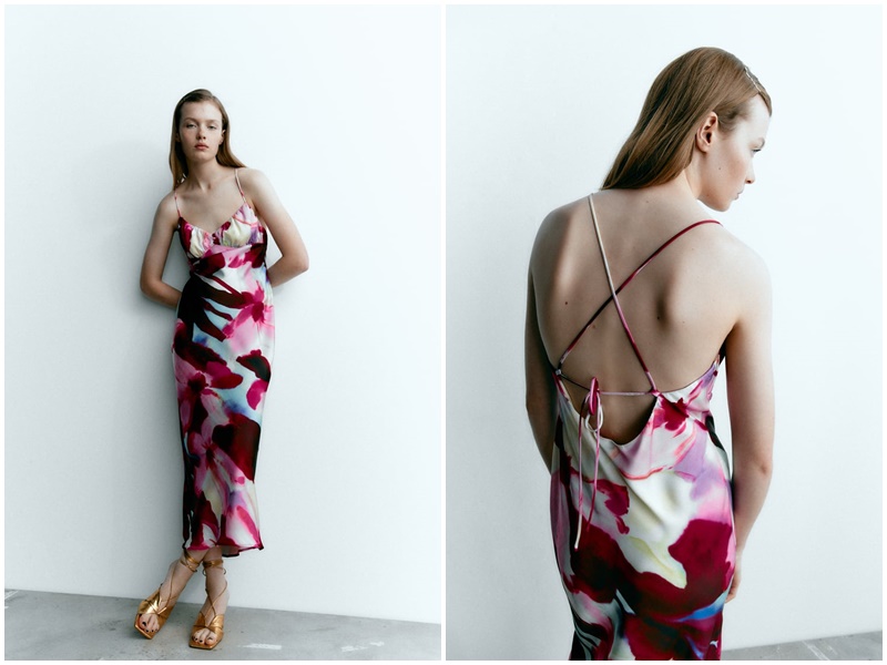 Hemos este otro vestido de invitada de la nueva colección de Zara, ideales para acudir a una boda, comunión o evento como para ir a cenar. Es estilo midi multicolor de escote pico con frunces y botones forrados a tono. Tiene tirantes finos cruzados en espalda con lazada. Una prenda todoterreno de la que no podremos deshacernos este verano. Su precio es de 35,95 euros.