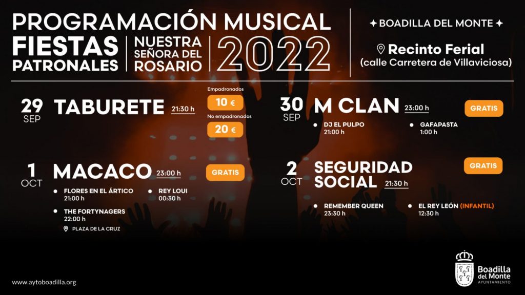 Pero Taburete no es el único grupo que llegará hasta Boadilla del Monte. Macaco, M-Clan y Seguridad Social, entre otros, actuarán en el municipio madrileño en sus fiestas patronales en honor a la Virgen del Rosario. Excepto Taburete, las actuaciones del resto de grupos serán gratuitas con entrada libre hasta completar aforo. De este modo, no es necesario sacar entrada. Como Taburete, el escenario será la carpa municipal.