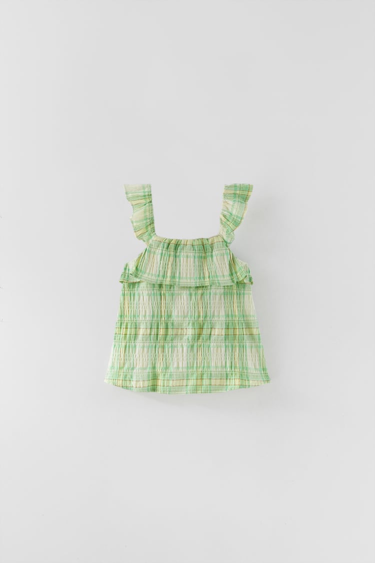 Para terminar la lista de los productos de la sección de niños de Zara que están rebajados, tenemos esta camisa de cuadros con un estampado verde que recuerda a un mantel típico de los picnics. Una prenda que se convertirá en un esencial para este verano con un precio de 3,99 euros y que se caracteriza por su cuello recto, los flecos en los tirantes que le da un toque más infantil a la prenda y un corte recto.
