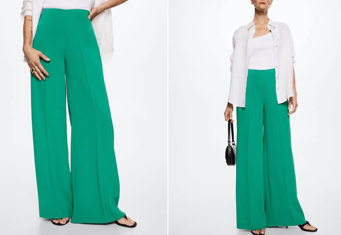 Tiene un diseño de pinzas, con tiro alto, estilo palazzo ancho y el color verde es veraniego, muy tendencia de esta temporada, aunque podrás elegir entre otros colores. Podrás formular un look con una blusa blanca con volantes para darle un toque más chic, o un top básico en color nude con una camisa de lino por encima. Estos pantalones de Mango también quedan muy bien con camisetas estampadas, si lo que buscas es un estilismo más informal y desenfadado. Y en cuanto al calzado, también puedes añadirle unas sandalias planas y seguirás teniendo ese efecto de piernas largas. Cuestan 39,99 euros.