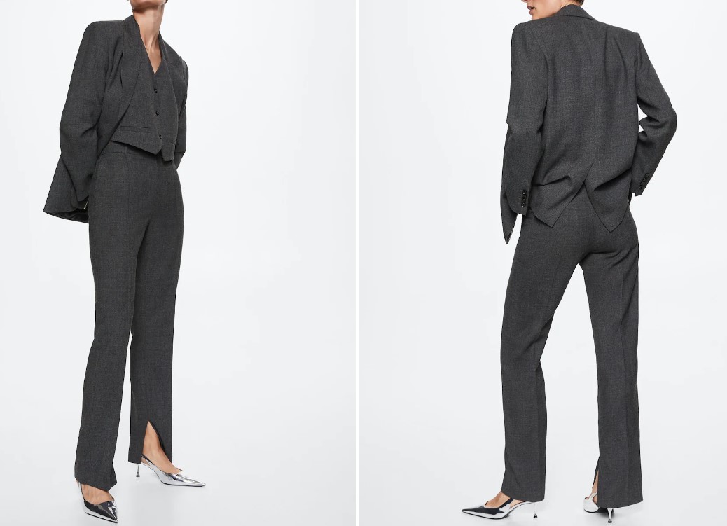 Este pantalón traje de punto lana de color gris vigoré está también disponible en negro. Como todo buen pantalón de vestir, presenta una costura en relieve en la parte delantera a modo de pinzas, es de tiro medio, incorpora trabillas. Cuenta con un par de bolsillos a ambos lados, perneras rectas con el bajo amplio y cierre frontal con gancho y cremallera. Aberturas laterales en el bajo y cierre oculto de botón, gancho y cremallera. Tiene un precio de 59,99 euros.