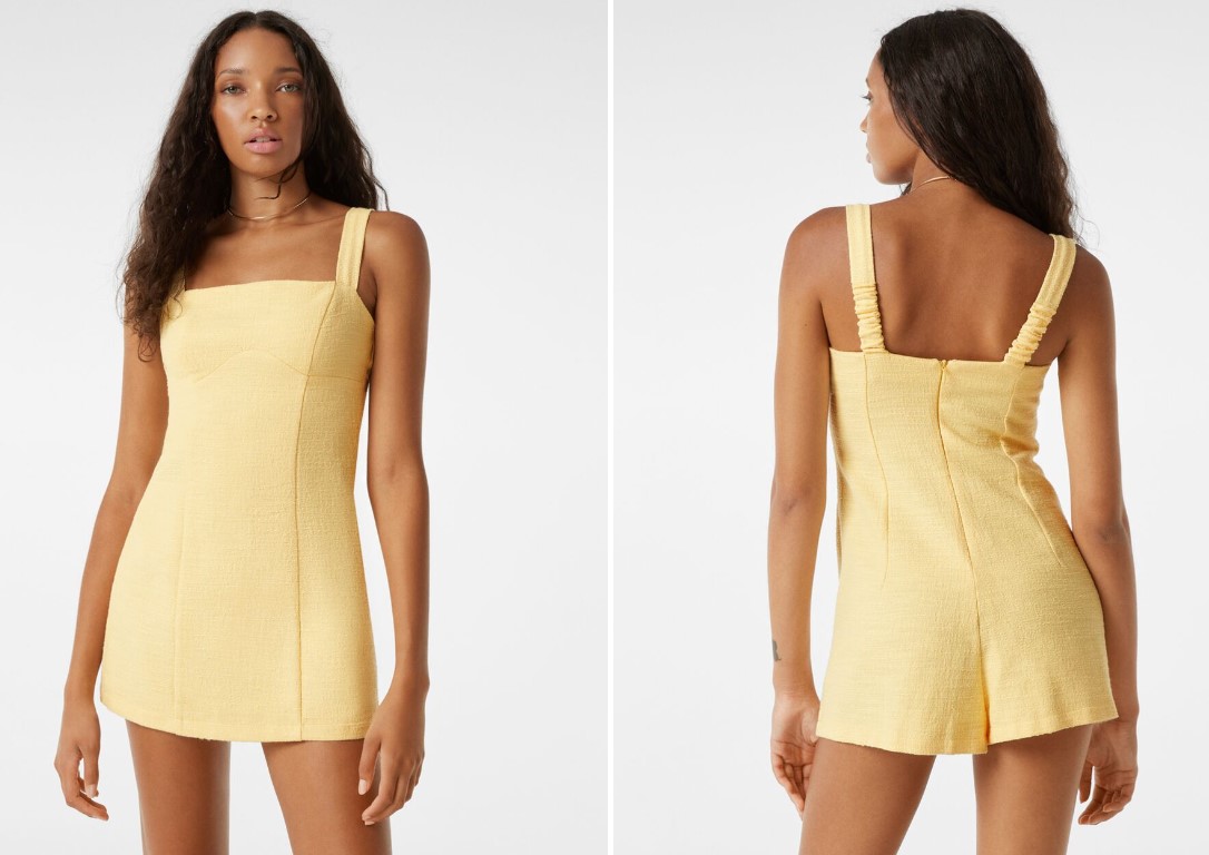 Por último, nos encontramos con otro mono corto color amarillo con diseño de falda pantalón. Tiene tirantes anchos y el escote es recto. Respecto a su diseño, de frente visualmente parece un vestido ajustado al cuerpo, pero, por el contrario, de espaldas nos encontramos con unos pantalones cortos. También lo encontramos en color blanco. Su tejido está confeccionado en 62% algodón, 30% poliéster y 8% viscosa. Tiene un precio de 29,99 euros.