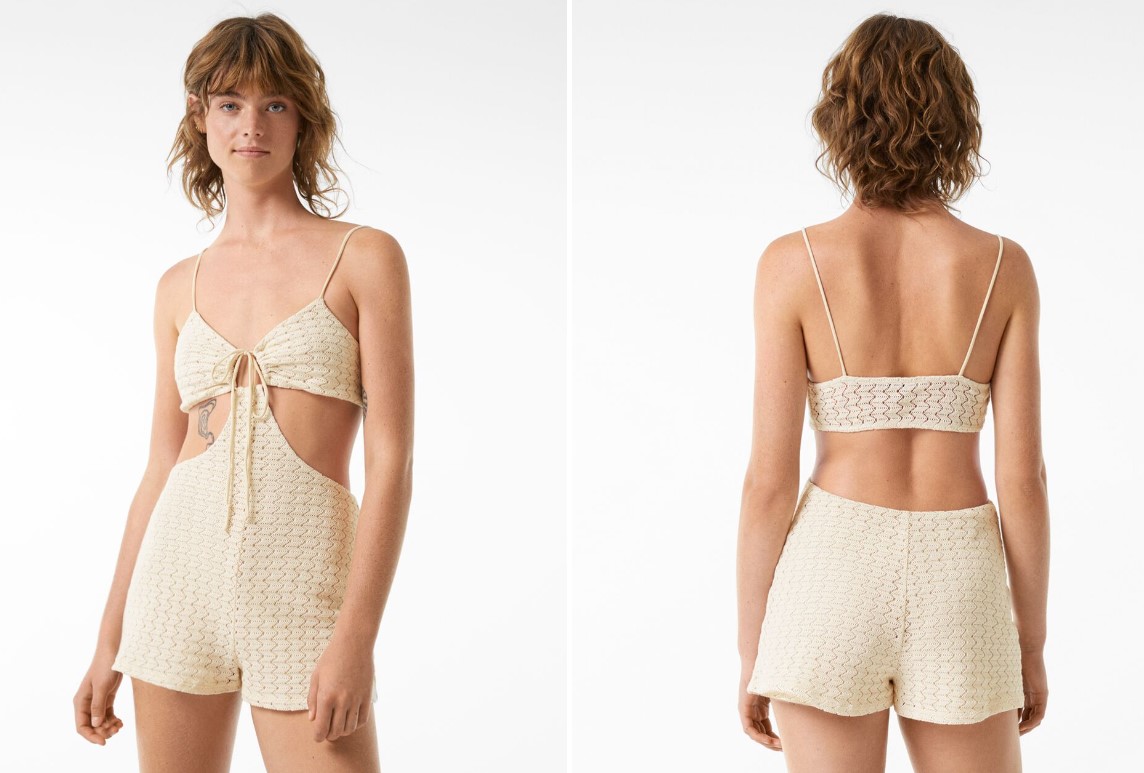Ahora nos encontramos con este mono corto de tirantes rústico realizado en crochet en color crudo. Respecto a su diseño, tiene la espalda abierta, escote en forma de pico y cuenta con un diseño de lo más diferente, mostrando un parte del abdomen. Este mono de Bershka tiene un precio de 25,99 euros.