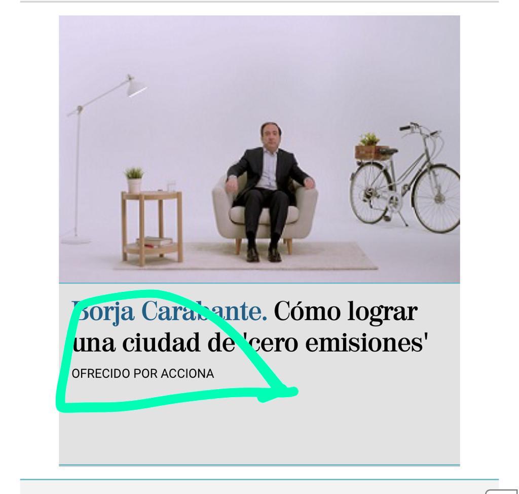 La multinacional española Acciona sigue utilizando a un concejal del Ayuntamiento de Madrid para sus contenidos patrocinados en medios de comunicación. Se trata del edil del Partido Popular Borja Carabante que ya aparece hasta en los banners que publica la empresa a modo de publicidad digital en medios de Internet. El concejal delegado del área de movilidad y medioambiente del consistorio madrileño ha realizado entrevistas a modo de spot publicitario por los que Acciona paga como contenido patrocinado en el diario digital El Mundo. Mientras su equipo de prensa pensaba que Borja Carabante haría una entrevista con un diario generalista y nacional, lo cierto es que el edil ha terminado siendo la imagen de la marca. Pero es que no solo ha protagonizado un vídeo entrevista que parece un spot publicitario sino que ahora aparece hasta en los banners de publicidad su imagen con una descripción explicativa en la que pone: «Ofrecido por Acciona». Tal y como se puede apreciar en la foto a continuación, Borja Carabante se presta una vez más como imagen de marca de la multinacional española presidida por José María Entrecanales.