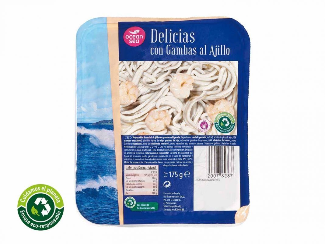 Y seguimos en el mar, porque puedes compaginarlo con estas delicias del mar con ajillo y gambas, o bien si quieres gastar poco optar por esto en vez de los langostinos anteriores. Es un envase de 175 gramos con un 22% de descuento y un precio de 1,55 euros. Ideal para un entrante, picoteo, para saltear y servir en ensaladas, como guarnición…