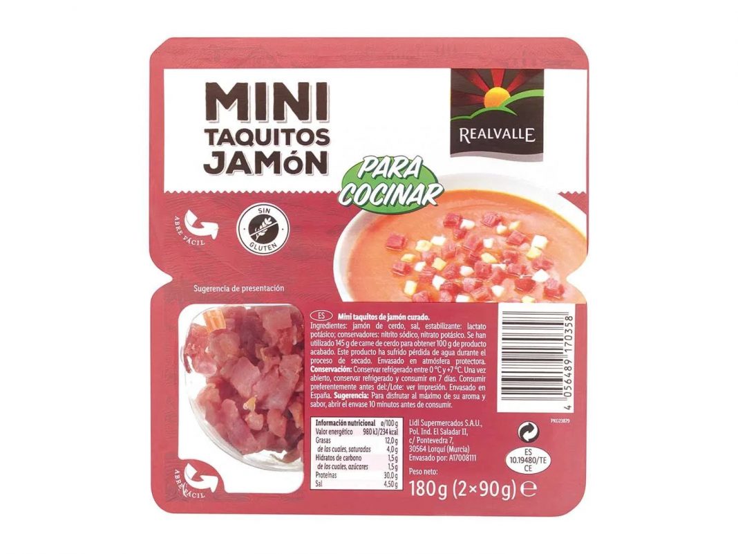 Es una compra ideal para este tiempo, no sólo por el descuento del sábado y domingo. Y es que si hay algo imprescindible como toque final en un salmorejo o gazpacho veraniego, es culminar con unos mini taquitos de jamón y de huevo cocido. Lo primero lo tienes en oferta en Lidl en dos envases de 90 gramos cada uno. Con el 22% de descuento se queda en 1,69 euros.