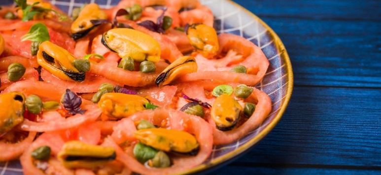 Lavar los tomates y cortar a rodajas finas, poner en todo el fondo del plato, añadir la sal y reservar. Separar la carne de los mejillones de la concha y reservar. Por otro lado, colocar las alcaparras y la vianda d ellos mejillones encima del tomate de manera decorativa y que quede bien puesto, junto con las hojas de rúcula, a la hora de servir aliñar con el aceite de oliva virgen y la reducción de Módena.