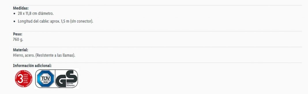 La lámpara insecticida disponible en Lidl está hecha a base de hierro y acero. Sus medidas son 28×12 cm de diámetro, por lo que te conviene ver donde la colocarás para que no moleste demasiado a tus invitados, aunque con dichas medidas suele estar perfecta en casi cualquier parte. Entre las recomendaciones de su uso, se encuentra el utilizar una sola lámpara en interiores y protegerla de cualquier situación en la que pueda adquirir humedad.