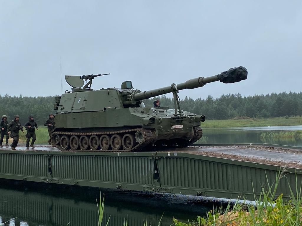 Gracias a un reciente twitter y las imágenes que incluía, de primeros de este mes de agosto, se informa que en el marco de la referida Task Force Latvia se ha formado una Unidad de Zapadores Hispano-Checa. Dicha fuerza, en el marco de los continuos ejercicios en el campo Adazi, ha completado con éxito un ejercicio que ha consistido en el montaje del PAV Dornier, que incluye la preparación del terreno. Posteriormente tras finalizarse la operación, el ejercicio continuaba con el paso por encima de éste de más de 70 vehículos. Entre éstos destaca el paso de al menos dos de los referidos M-109A5E, que tienen un peso en combate de 24,5 toneladas, como atestigua el 25 enmarcado en un círculo pintado en el medio de cadenas, lo que da una idea de la capacidad del veterano PAV Dornier.no