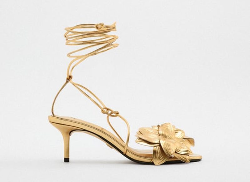 Si estás pensando en tu calzado para cualquier evento o celebración, esta sandalia piel tacón medio atada flores es una opción muy a tener en cuenta. En este caso se encuentra disponible en color oro y en rojo por un precio de 79,95 euros.