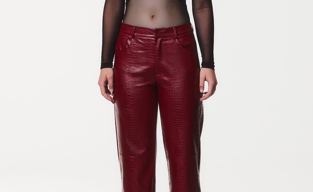 La mejor forma de definir estos pantalones de Stradivarius es decir que son similares a la falda con la que hemos abierto este artículo, solo que lógicamente con un diseño diferente. Pero el efecto de piel es el mismo, igual que el color. La prenda vale 35,99 euros.