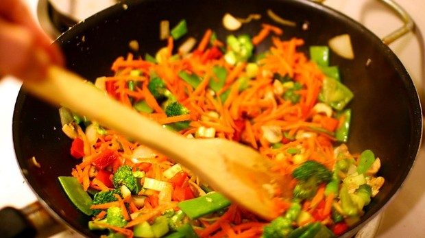 Mientras se van haciendo las lentejas, aprovecha para hacer el alma de este plato: el sofrito de verduras. Para ello ponemos en la sartén aceite de oliva, cebolla, ajos laminados, los taquitos de chorizo si es que los añadimos, y el pimentón. A continuación, pondremos el resto de verduras que hayamos escogido, en este caso las de la lista por la que hemos optado: zanahoria, berenjena, etc., picada con trozos regulares y similares.