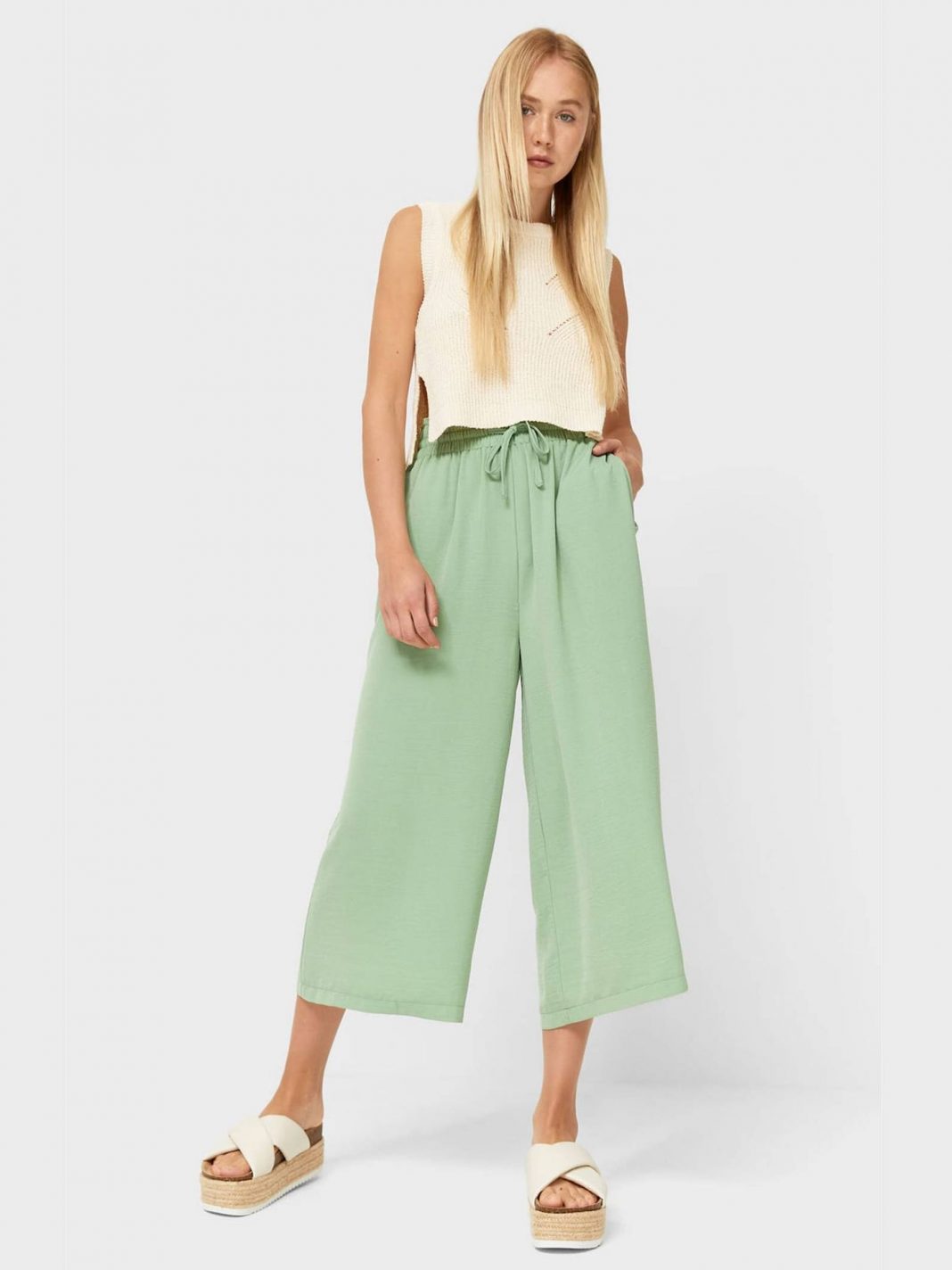 Los pantalones anchos estilo ‘palazzo’ o pata elefante están pensados para que tus piernas se vean más largas. Este efecto se intensificará si los utilizas con unos tacones altos. En cuanto a la parte superior, debes tener presente que debe complementar a la sensación que estás tratando de enseñar en la parte de abajo. O sea, te conviene utilizar prendas que puedas meter dentro de la cintura o tops, chaquetas o jerséis finos.