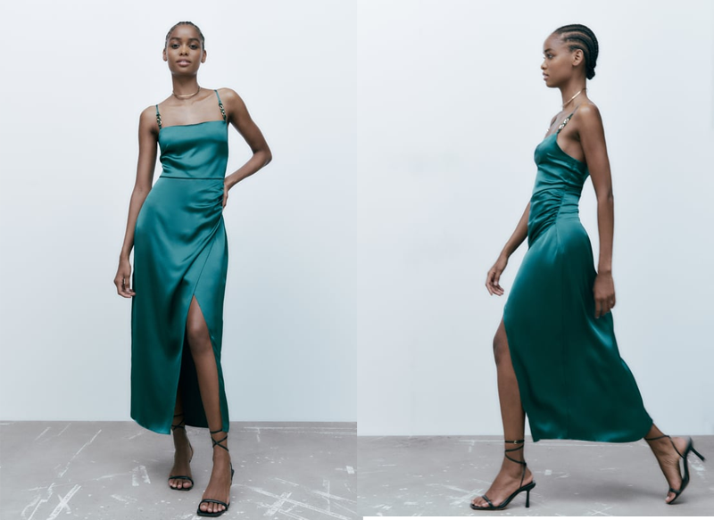 En Zara podemos encontrar vestidos para todo tipo de situaciones y momentos. Una de sus novedades que está llamada a ser todo un éxito es su vestido lencero satinado en color verde pato, que se vende por 35,95 euros.