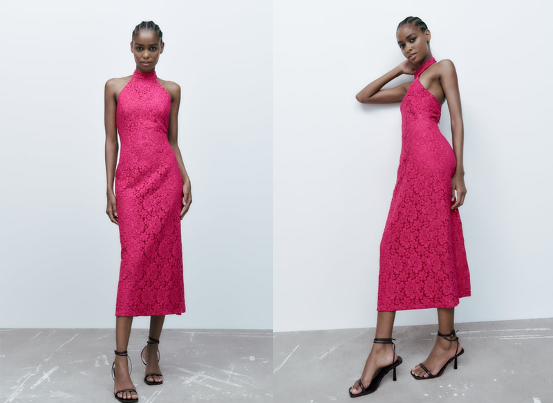 Este vestido halter encaje de Zara de color fucsia puede ser el modelo que estás buscando para dirigirte a cualquier evento o fiesta, un modelo elegante a la par que moderno que se vende por 39,95 euros.