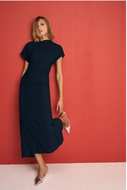 Vamos con un vestido de lana, tan de moda e ideal para el entretiempo que se avecina, en esas semanas donde igual necesitas un vestido veraniego que uno otoñal, o mejor uno que case con ambos. Este puede ser uno de ellos y a muy buen precio para la calidad que tiene en diseño y tejido. Es un mido con mezcla de lana, cuello redondo y manga corta. Tiene detalle de tejido drapeado, cierre con cremallera oculta en costura y su precio está en 79,95 euros. Otra gran elección.