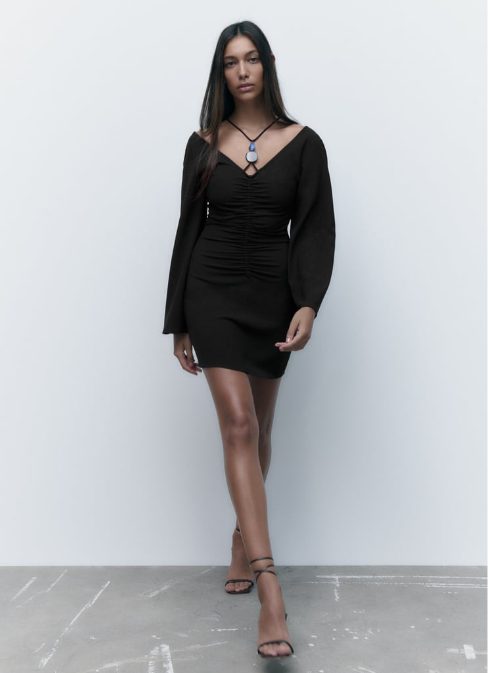Seguimos con vestidos cortos pero este más ajustado, con un diseño totalmente diferente pero igualmente irresistible para ocasiones especiales. Es un vestido escote pico con aplicación de tirantes finos y piedras, manga larga ancha, detalle de frunces delanteros y cierre lateral con cremallera oculta en costura. Está en todo tipo de tallas, de XS a XXL y todas a un precio de 29,95 euros. Como ves, no cuesta tanto renovar parte del armario de vestidos con novedades.