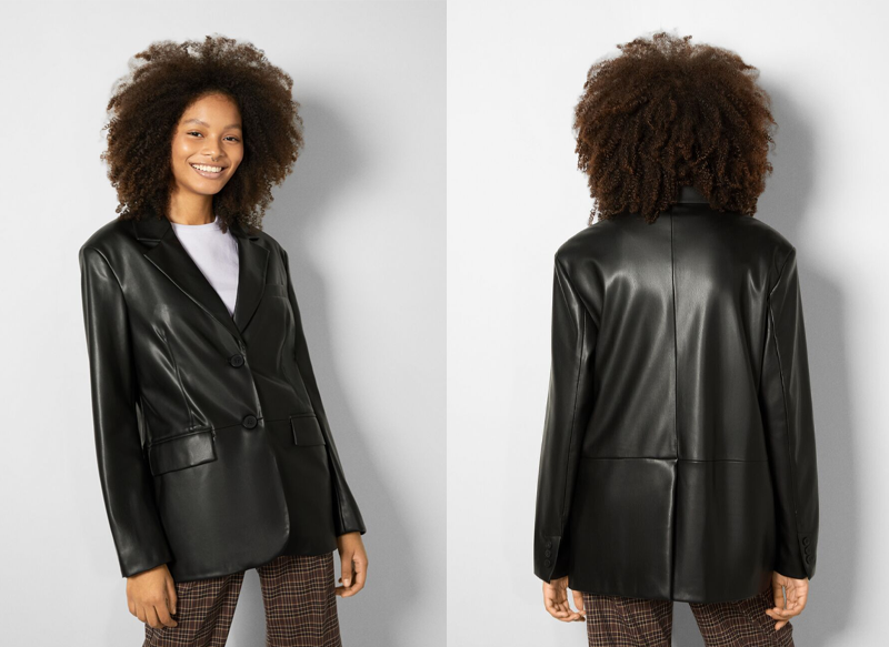 Esta blazer oversize efecto piel de Bershka es la prenda de entretiempo más vendida de la firma perteneciente al grupo Inditex, una prenda que se puede encontrar en colores negro, amarillo y rosa por un precio de 35,99 euros.