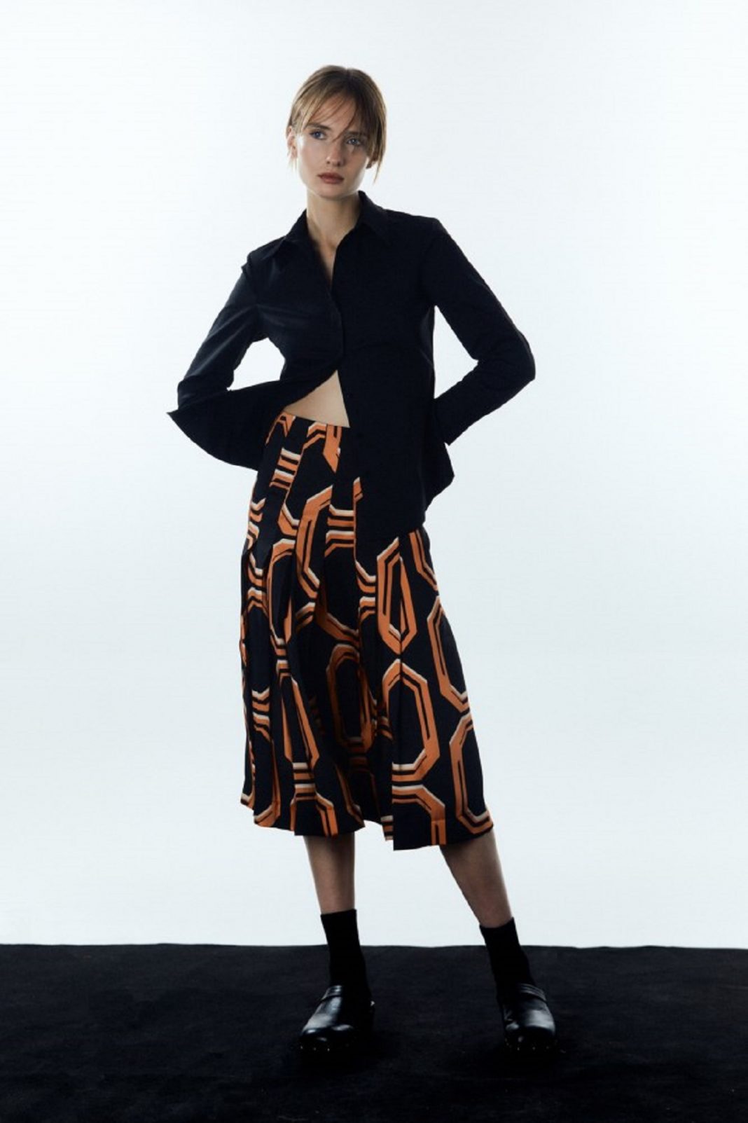 Esta temporada la geometría vuelve a adueñarse de las prendas. Esta falda midi tiene dos colores muy superpuestos: naranja y negro. Dos tonalidades muy dispares que vienen a romper con las normas y dar un mensaje de orden en el desorden. Aunque la modelo lo lleva con una camisa negra, también puedes combinarlo con blanco en los días de más sol, aprovechando que la prenda presenta franjas blancas.