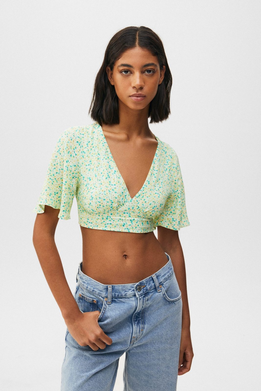 Las prendas cropped son las favoritas a la hora de lucir figura. En este caso, esta blusa de Pull&Bear destaca por su diseño, así como por su estampado floral y su tono verde, muy romántico y actual. Con mangas sueltas y escote en pico, combinará con todas tus prendas superiores. Además, ahora la tienes disponible por solo 12,59 euros cuando antes costaba 17,99.
