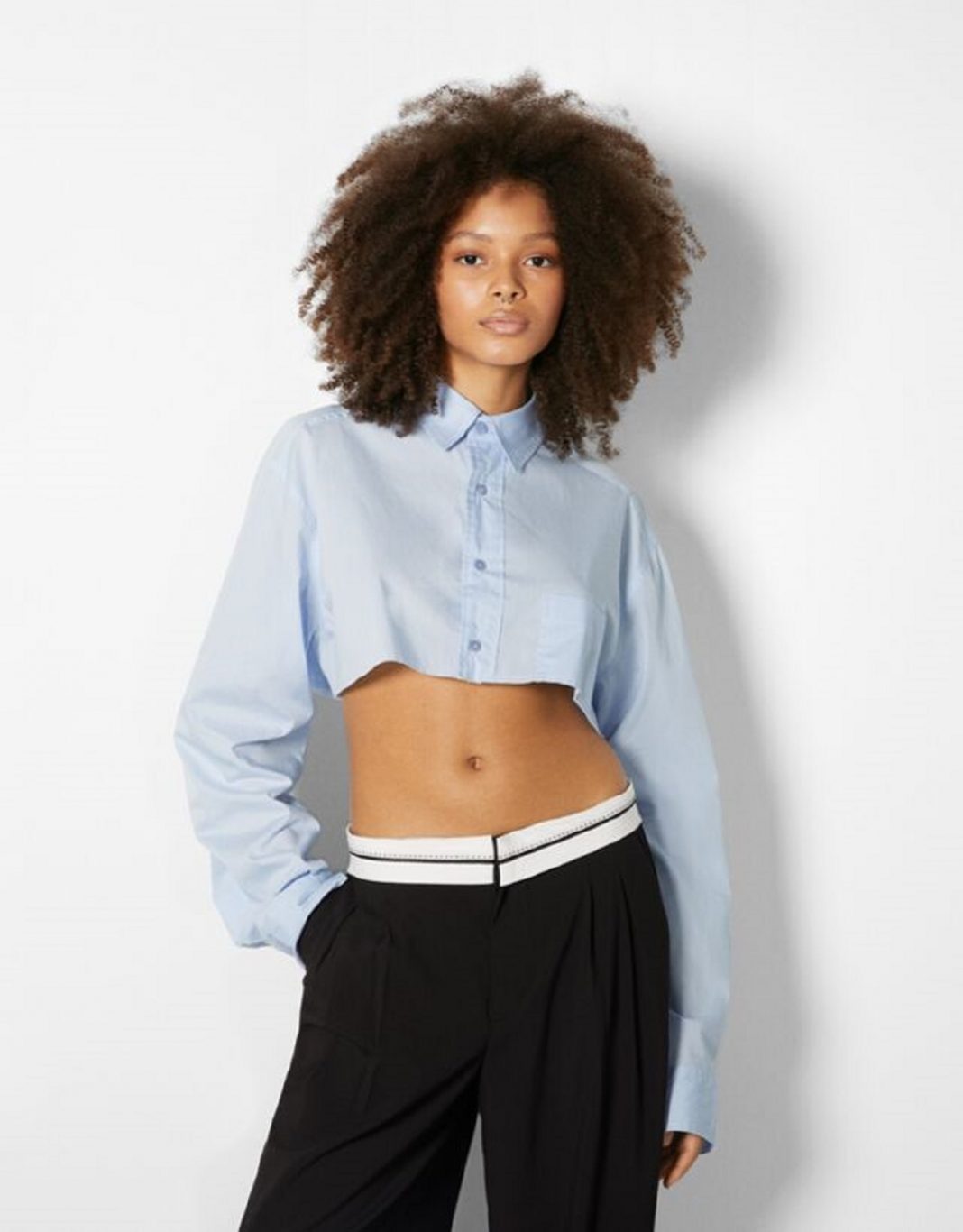 Esta camisa con el ombligo al aire nos recuerda que todavía queda un atisbo de calorcito. Puedes llevarla cerrada y luciendo el ombligo o abierta con algo debajo. Optar por un pantalón ancho si buscas algo más desenfadado o pantalones apretados y tacones si buscas algo más elegante. Los pantalones de tiro alto pueden taparte la barriga y aprovechar la tela celeste para crear un ‘look’ de infarto. Sea como fuere, ¡estarás matadora! No habrá tarea que se te resista y todos se darán cuenta de que estás presente.