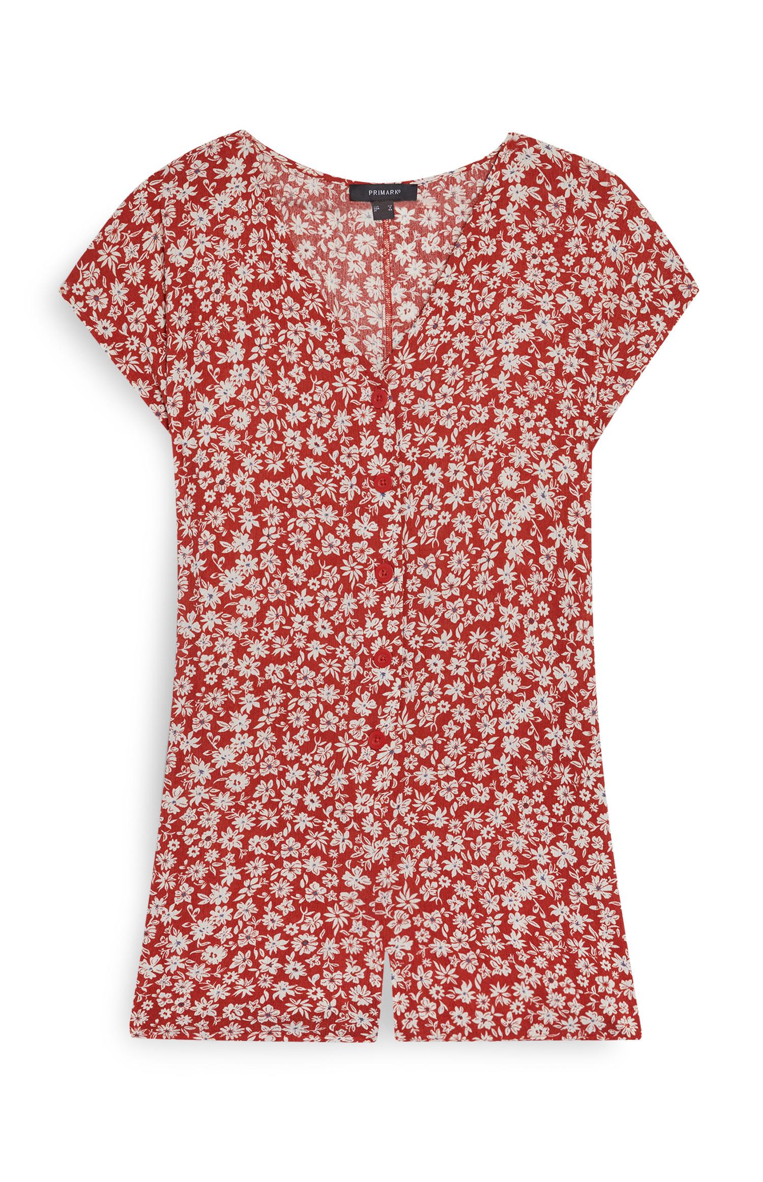 Seguimos con este encantador mono en color caqui colorado y con un estampado de flores y palmeras en corto de Primark. También de manga corta y con el escote en pico, lleva los botones a juego en toda la parte central y pensamos que es ideal para lucir los colores propios de esta temporada con un toque de gracia y distinción. Y en cuanto al precio, por 9 euros puede ser tuyo.