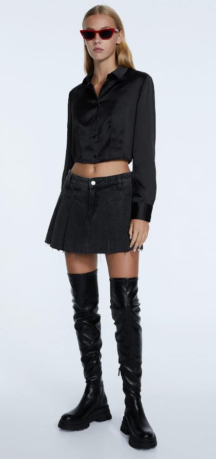 Una camisa moderna, con estilo y carácter ideal para tus salidas nocturnas. Y no es para menos, parece que los diseñadores de Stradivarius han creado esta pieza por y para salir de fiesta. La camisa satén corta pinzas está disponible en la tienda online y en los establecimientos de la marca por tan sólo 19,99 euros. Si hay algo que llama la atención de esta prenda es su corte por encima del ombligo, que a muchas enamora y a otras no les llega a convencer, además de su color negro, su cuello solapa y su manga larga slim que estiliza la silueta.