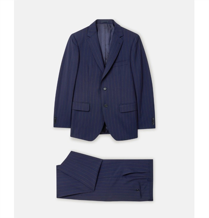 Precioso traje chaqueta de hombre confeccionado en lana. Es un traje clásico de rayas azul marino. La americana tiene forro a tono similar, cierre con dos botones en la parte delantera, solapas de muesca y dos bolsillos delanteros tipo cartera recta. El pantalón tiene raya diplomática, dos bolsillos traseros franceses, y se cierra mediante botón y cremallera que se oculta con solapa. Con este traje te vas a sentir seguro en cualquier situación.