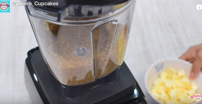 Empezamos poniendo todas las galletas en la licuadora. Ponemos todo dentro y lo trituramos durante 15 segundos a velocidad baja. Este tiempo será suficiente para que queden trituradas. Luego, derretimos la mantequilla a fuego lento o en microondas. Cuando esté liquida la añadimos sobre las galletas trituradas.