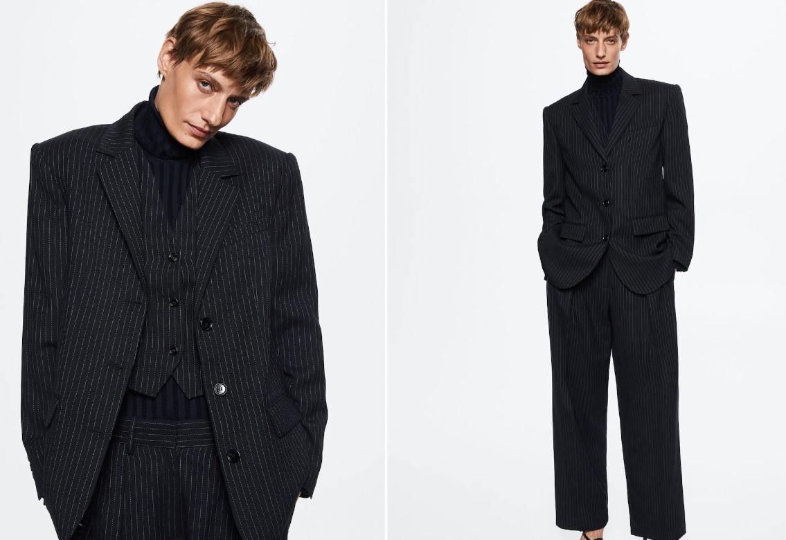 Seguimos mostrándote cómo puedes seguir agregando prendas a este look para la vuelta a la oficina. Mango tiene esta americana de traje lana con raya diplomática que va a juego con el chaleco y el pantalón. El precio es de 99,99 euros. Se trata de una cápsula de prendas con siluetas impecables y materiales de excelente calidad. Diseñadas con un estilo atemporal que tiene como objetivo perdurar en el armario. A este outfit le agregamos un jersey canalé cuello vuelto de 35,99 euros, y un cinturón de piel con hebilla cuadrada que cuesta 25,99.