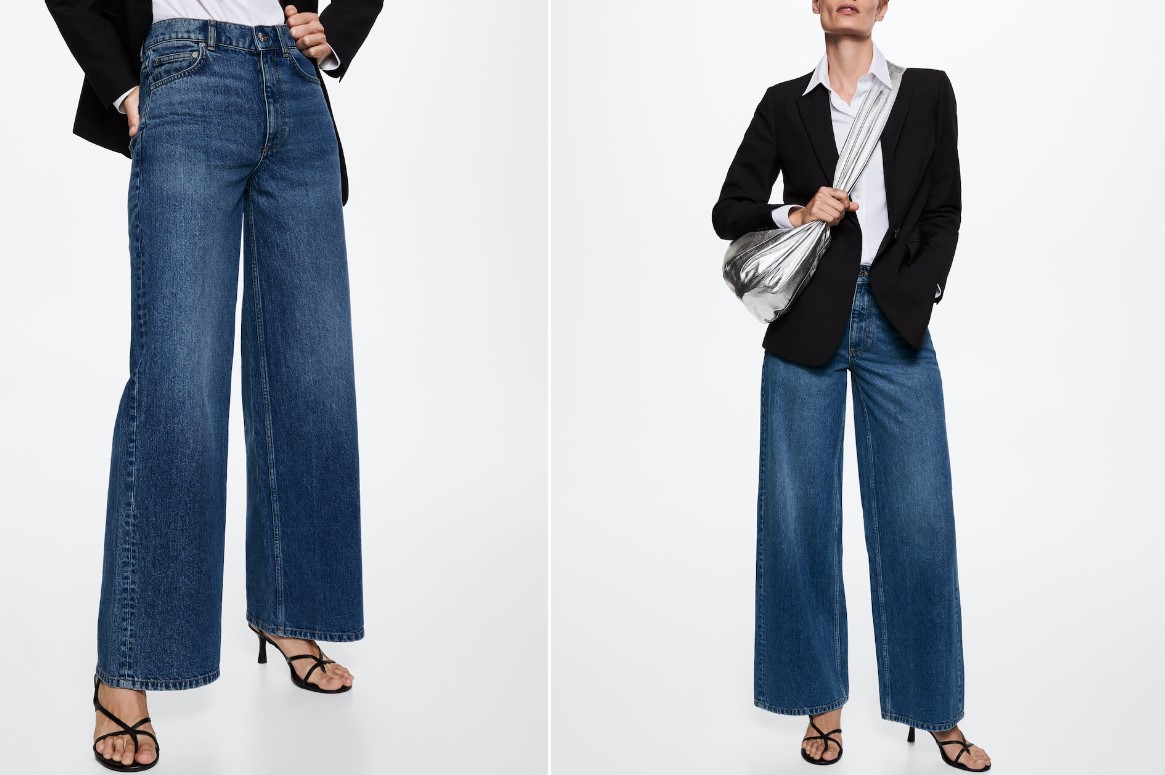 La moda oversize nos da ese toque desenfadado y cómodo al look. Por eso traemos otra propuesta para combinar con la americana que te mostramos anteriormente. Podemos combinar el tejido denim más informal con una americana que le da el toque oficinista. Mango cuenta con una selección de vaqueros para todos los gustos, aunque nosotros, en esta ocasión, nos hemos decantado por los jeans wideleg tiro medio. Por un precio de 39,99 euros puedes combinar estos jeans con una camiseta básica monocolor o una camisa popelín de algodón orgánico que vimos en la tienda y cuesta 39,99 euros.
