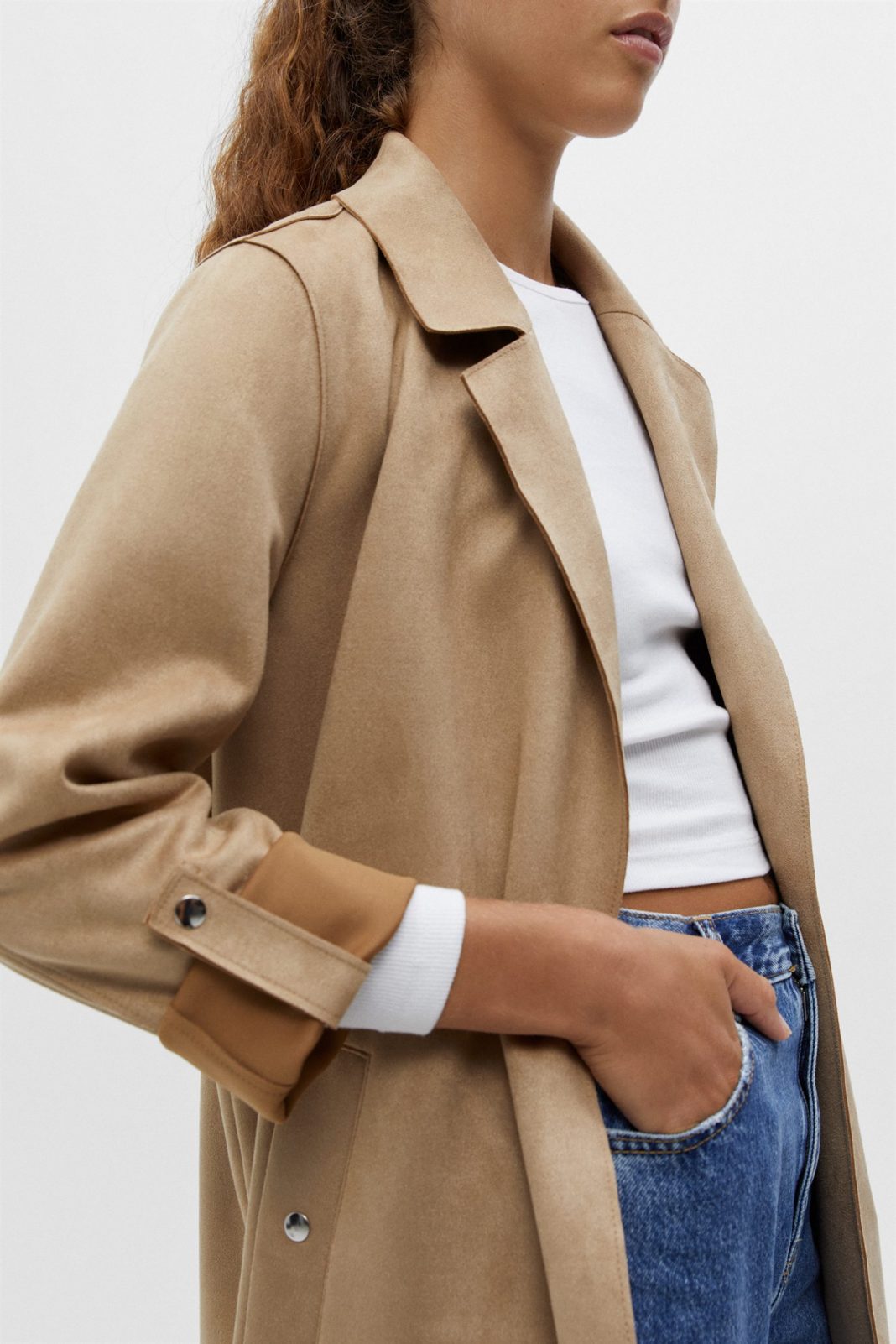 Si todavía crees que es pronto para comprarte un abrigo, Pull&Bear te propone muchas opciones intermedias, como esta chaqueta larga en tejido de antelina con mangas roll-up, cuello solapa y bolsillos delanteros. Está disponible en el clásico color beige camel característico de este tipo de tejido, pero también en blanco y en negro, para que elijas el que más te guste. Su corte por debajo de la cadera lo convierte en una prenda elegante y versátil que, sin duda, le dará un toque especial a todos tus looks. Lo mejor de todo es que solo cuesta 25,99 euros, lo que lo convierte en una de las mejores opciones del mercado.