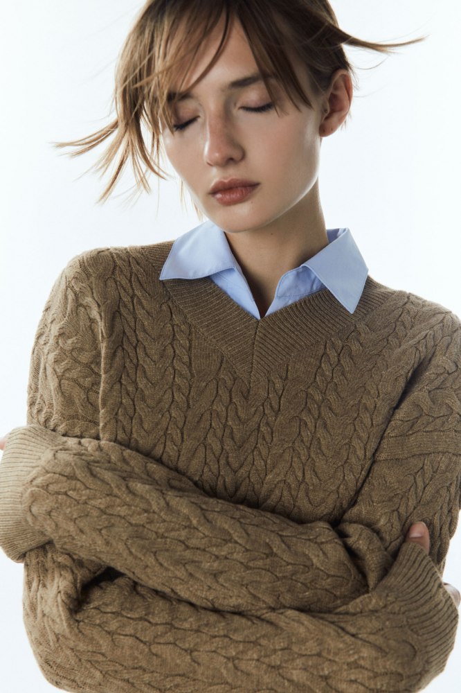 Los jerseys son esas prendas que siempre nos gusta llevar en cuanto dejamos atrás el calor. En este caso, sin embargo, llama la atención este de Sfera gracias a la originalidad que le confiere su diseño corto y de ochos. Con un bonito tono marrón, podrás hacerte con él por tan solo 25,99 euros.