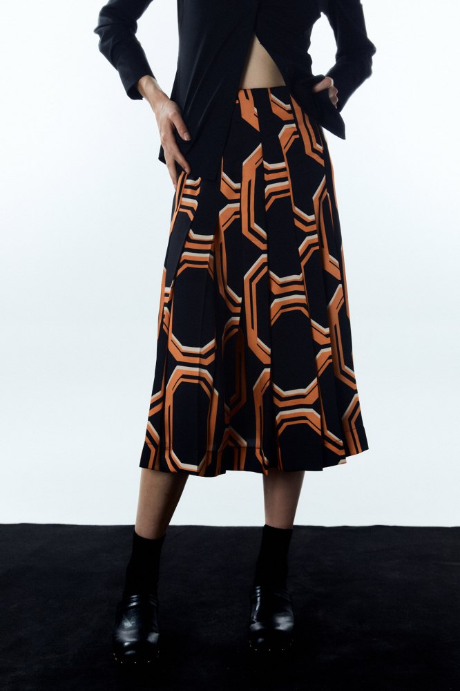 Las faldas midi prometen convertirse en las más buscadas de la temporada debido a su carácter casual, pero siempre elegante. Esta, de Sfera, destaca gracias a su base en color negro y a su estampado geométrrico de color naranja, muy llamativo. Con un precio de tan solo 35,99 euros, además es una gran oportunidad.