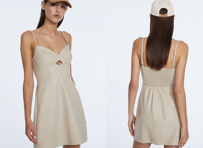 Entre los vestidos más interesantes que podemos encontrar en el actual catálogo de la firma del grupo Inditex se encuentra este vestido corto efecto piel cut outs en color beige. Su precio de venta es de tan solo 22,99 euros y podrás utilizarlo en numerosas ocasiones diferentes.